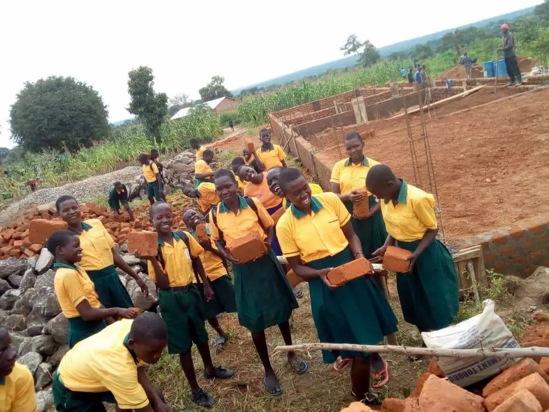 Picture here of students joining together to help the builders construct their new classrooms.