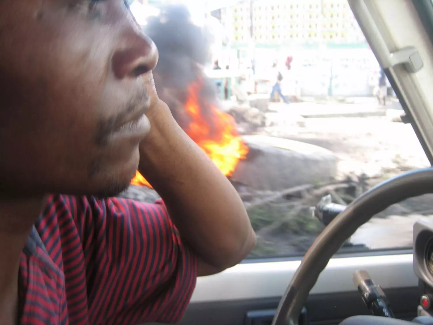 With huge (double digit) inflation impacting costs of food and fuel over the last few years, the Haitian currency plummeting against the US dollar and the national budget deficit at a record high, the current anger being shown is not just a sudden, spur of the moment thing. But, some more recent reports and allegations on Government corruption have added to the fire, bringing thousands of people to the streets to demand change. Protests and road blocks in and out of key cities has lead to schools, businesses, public services etc. being forced to close for a week now, and as things are, the stand off between opposition parties calling for change and the Government, remains an unresolved stale mate. (Picture below of one of our ambulance drivers working in previous protests)